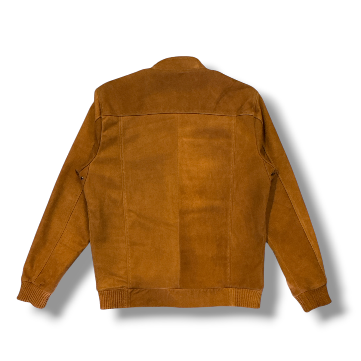La chamarra Alba fabricada en piel de borrego con acabado nobuk que le da ese aspecto aterciopelado y suave característico, hecha artesanalmente en Oaxaca. Es de color café camel, con un tono cálido y uniforme que resalta la calidad del material.